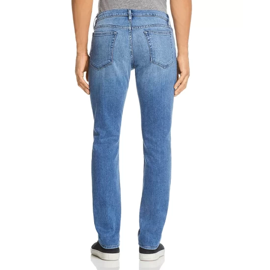 - Belt loops, zip fly, five-pocket design, whiskering and fading at thighs and knees