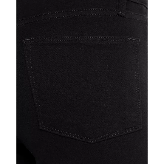 - Zip fly with button closure, five-pocket silhouette