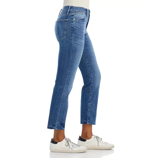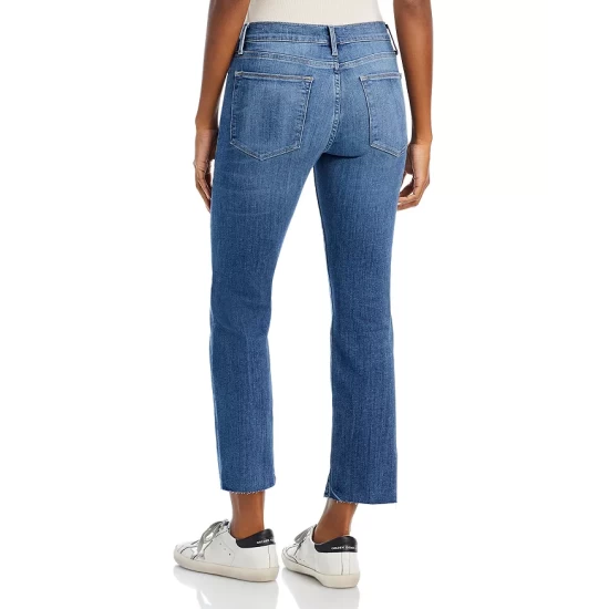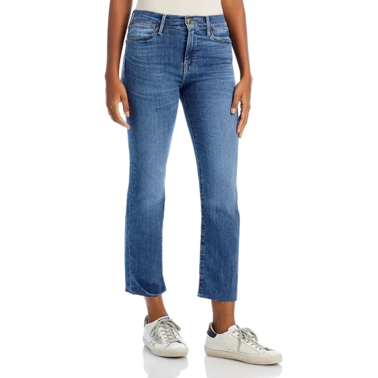 - Straight-leg silhouette, raw-edge hems
