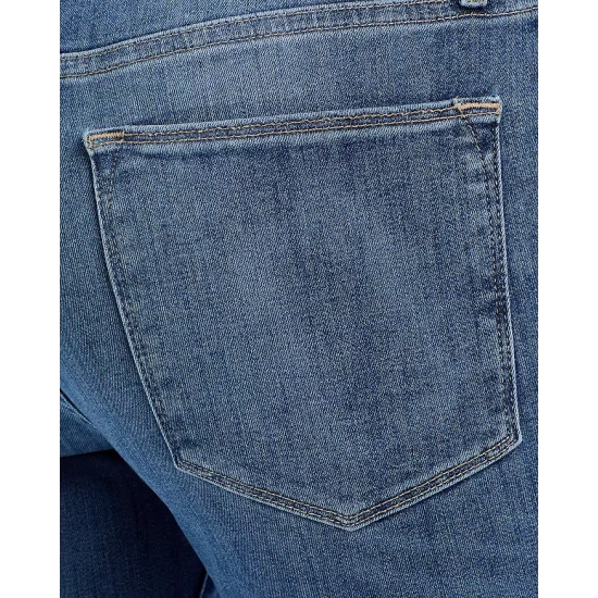 - Zip fly with button closure, five-pocket silhouette