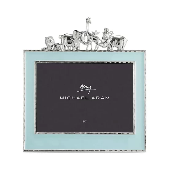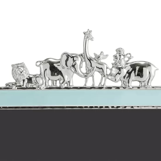 - Assorted metallic animal accents atop a blue enamel frame