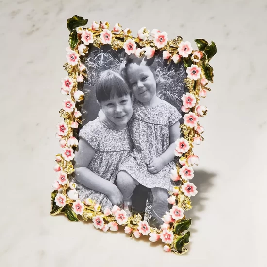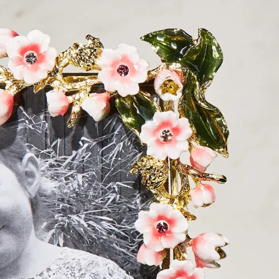 - Handcrafted in gold-tone finish pewter, handset with pink and clear European crystals and hand-enameled flowers