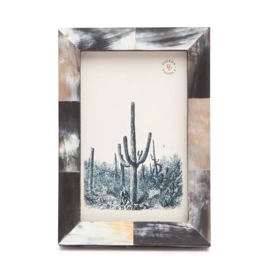 - Pigeon & Poodle’s Essen frames are made of African horn panels in hues that range from rich chocolate to natural cream.