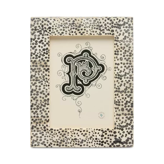 - A blend of whimsy and opulence, this frame collection features gleaming gold-tone spots on bone.